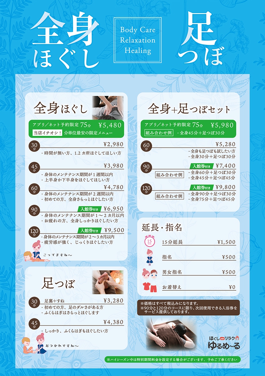 筋肉のもみほぐしやツボの刺激により血行を促進し、お疲れ箇所をダイレクトにケアいたします。全身コース・足つぼ・セットコースもございます。