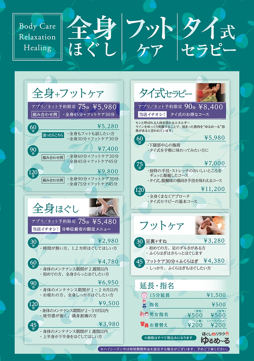 全身ほぐし、フットケア、タイ式セラピーなどお客様のお好みに合わせたメニューをお選びいただけます。